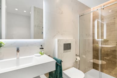 On the main level, you’ll be greeted by a spacious living area seamlessly connected to a sleek open kitchen, along with a stylish guest bathroom. Floor-to-ceiling windows open to a private outdoor oasis featuring a sparkling swimming pool, lush landscaped gardens, and a shaded al fresco dining area with a barbecue grill—perfect for relaxing afternoons and memorable gatherings.